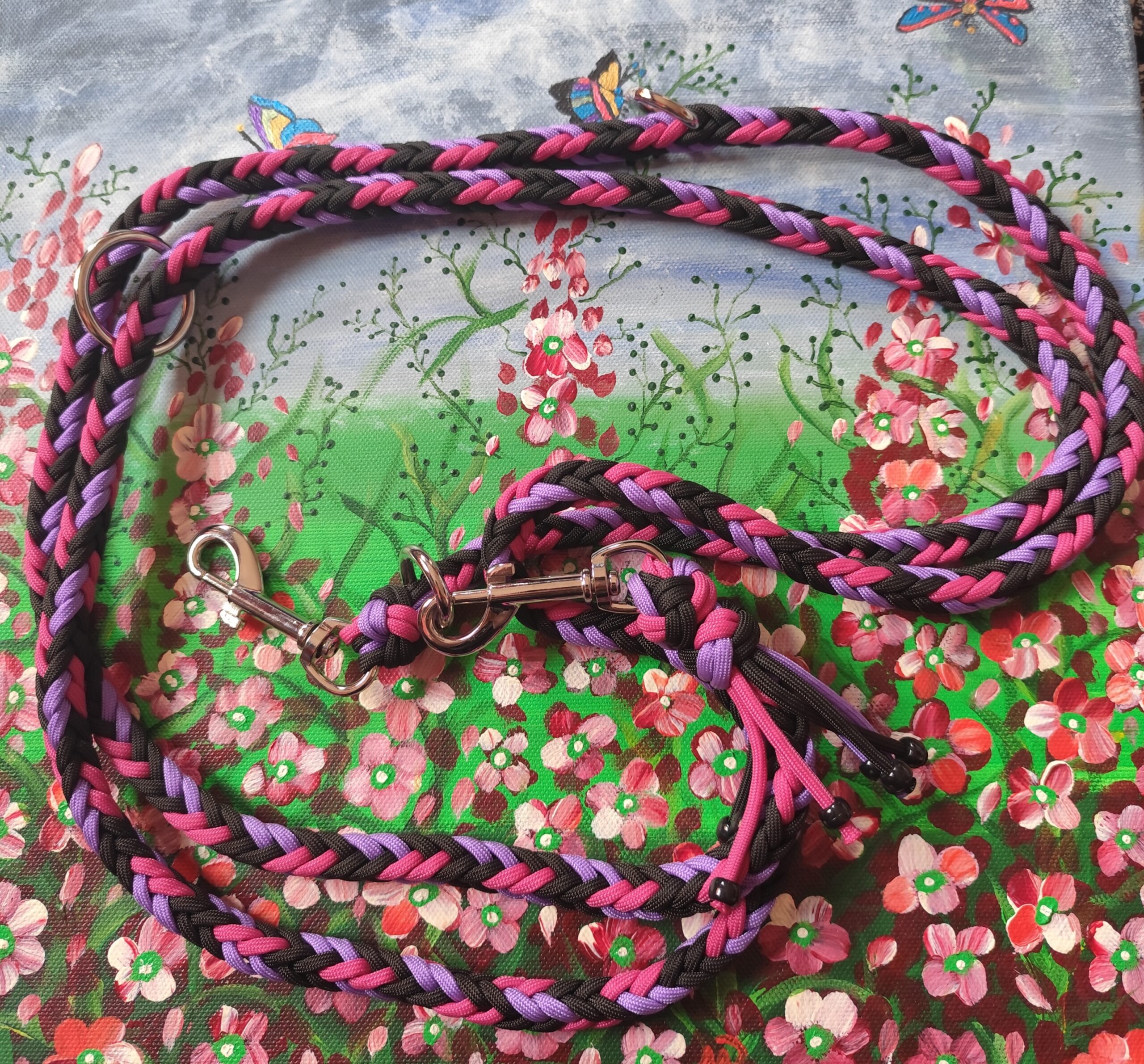 Handgemachte Hundeleine aus hochwertigem Paracord in den Farben lila, schwarz und rosenrot.