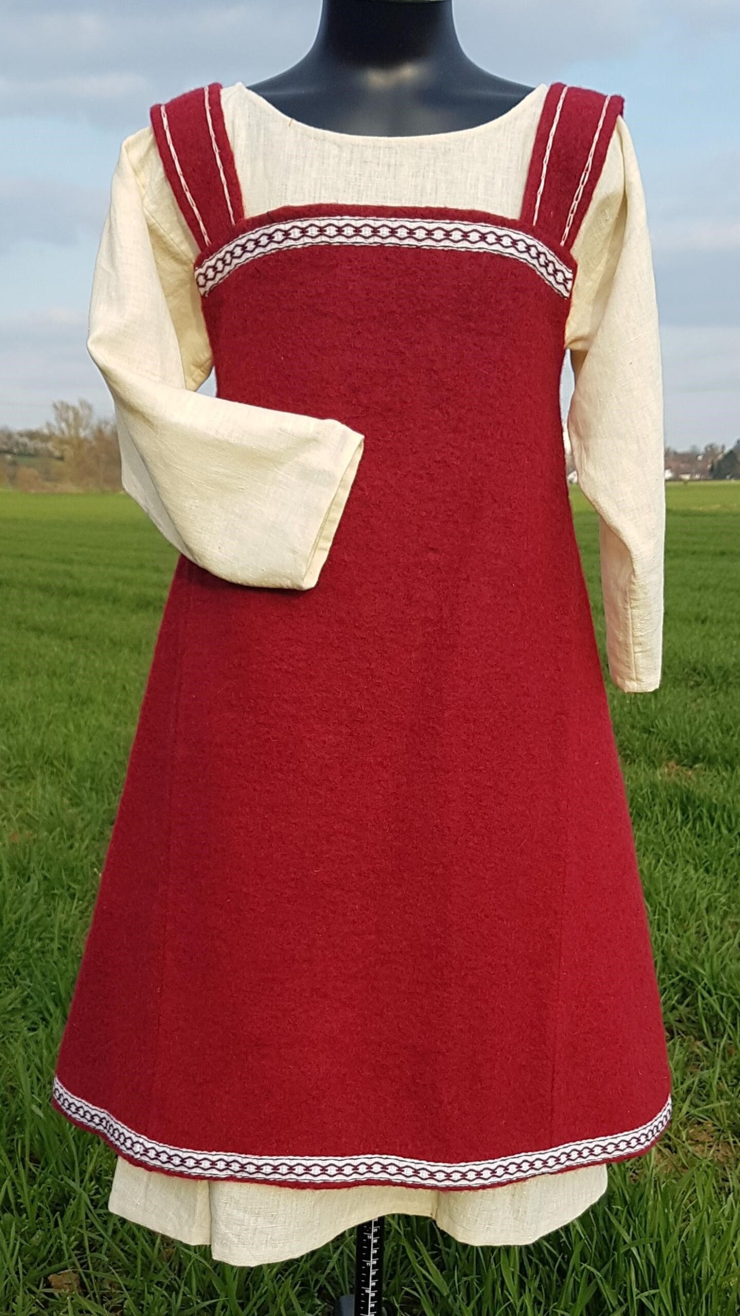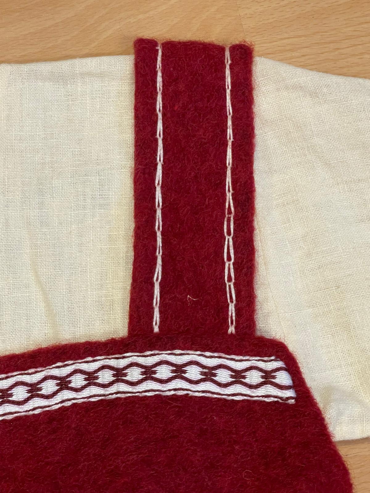 Trägerrock/Überkleid mit handgewebter Borte und Zierstichen.