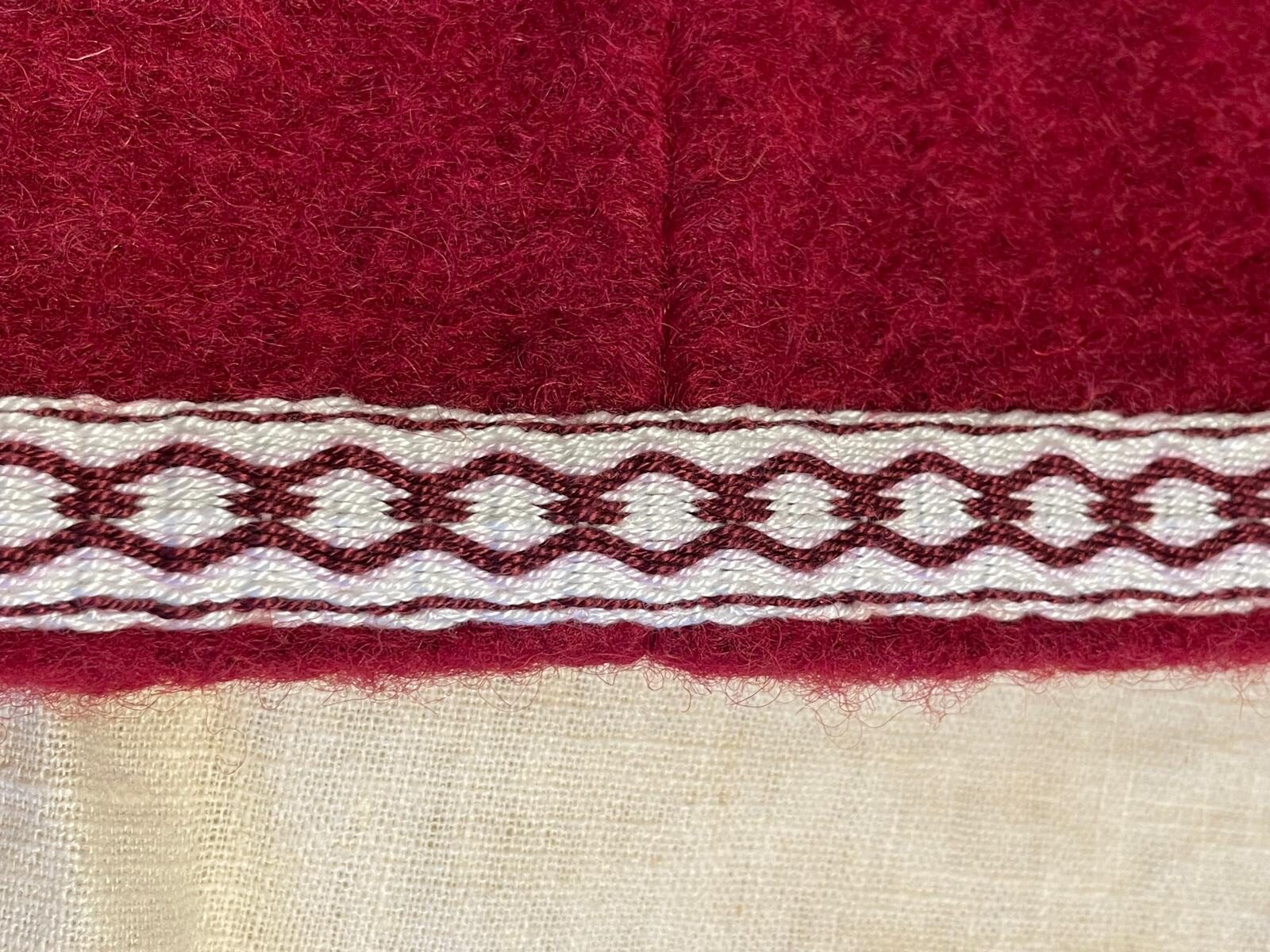 Die Borte ist von mir auf einem Webrahmen mit Brettchenwebkunst handgewebt und ist aus Baumwolle und per Hand aufgenäht.